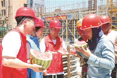 昨日,在台州市路桥区蓬街镇卫生院建设工地,工人们吃着蓬街镇总工会党员干部送来的西瓜。当日,蓬街镇总工会组织党员干部为坚守在城市建设一线的建筑工人、环卫工人、电力工人等送去西瓜、饮料、藿香正气水等防暑慰问品。