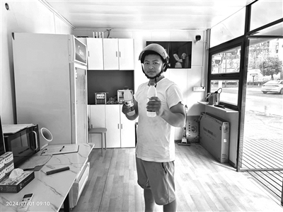 | 外卖小哥在岩河社区户外劳动者爱心站点领取清凉物资。 |