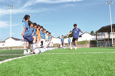 昨日,建德市寿昌第二小学的首批暑期足球夏令营的60多名孩子在老师指导下,正在运动场上分点开展学练运球、踢球、带球等足球基础训练,孩子们个个练得有模有样。