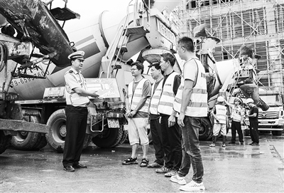图为浦江交警在辖区浙江顺字混凝土有限公司对商砼运输驾驶人员进行夏季安全出行宣传。通讯员杨晓东 摄