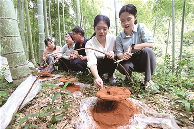 图为在舞阳街道塔山灵芝种植基地,清华大学博士生观察林下灵芝培育情况。