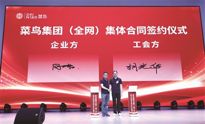 | 企业方代表和工会方代表共同签订《菜鸟集团(全网)集体合同》。见习记者任杰 摄 |