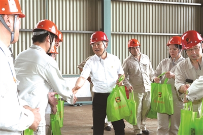 在宁波钢铁有限公司,章建成一行深入生产一线高温作业现场,先后来到原料场绿色智能改造项目B型库、炼铁厂2号高炉炉前、废钢智能加工配送中心等地,向奋战在高温一线的广大干部职工“送清凉”,并表示衷心感谢。图为章建成(中)向生产一线员工送上慰问品。
