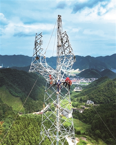 7月11日,开化县华埠镇崇山峻岭间,一队电力工人正顶着烈日架设电力铁塔。他们身穿厚重的工作服,头戴安全帽,手戴防护手套,用滑轮把钢构件吊升至铁塔顶端,固定在塔身上。泛着银光的电力铁塔,不断向高空延伸……