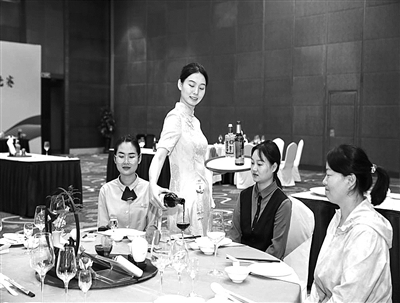 现场,参赛选手竞新斗巧,创作了多个以城市文化、城市背景等为主题的作品。值得一提的是,今年为更好贴近生活,提升服务水平,中餐宴会摆台新增了对客户的服务内容,包括迎宾、餐前服务、酒水服务、送客服务等,充分展现餐饮酒店业真诚热情的优质服务。