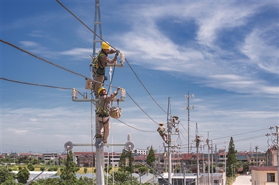 连日来,绍兴市上虞区加紧对农村老旧电力线路进行改造提升,保障沿途村民高温季节可靠用电。图为绍兴市上虞区舜兴电力有限公司电力工人正在冒着高温酷暑赶工。
