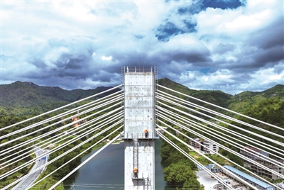 7月24日10时,中央气象台发布台风红色预警,今年第3号台风“格美”将给东南沿海地区带来强风雨。中国铁路上海局集团有限公司宁波工务段成立了防洪检查小组,图为检查小组的铁路工人对杭温高铁楠溪江大桥主塔进行巡检(无人机照片),确保铁路安全。新华社记者江汉 摄