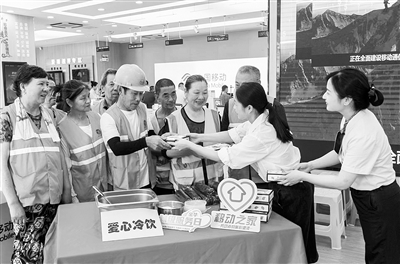 工作人员为环卫工人精心准备了清凉冷饮、矿泉水、毛巾、遮阳伞、防暑药品,邀请他们走进移动营业厅的“爱心驿站”,吹吹空调,喝点冷饮,休息片刻。“你们辛苦了,天气这么热,一定要注意防暑降温,欢迎到我们营业厅来歇脚纳凉。”工作人员一边递上清凉物资,一边关切地叮嘱道。