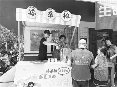 开摊现场,还有不少小伢儿的身影。来自青蓝小学的同学们化身志愿者,为户外劳动者和街区居民递上一杯凉茶,送去一声问候,让凉茶摊充满了朝气和活力。