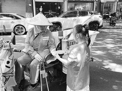 | 孩子将亲手熬制的绿豆汤送到户外劳动者手上。 |