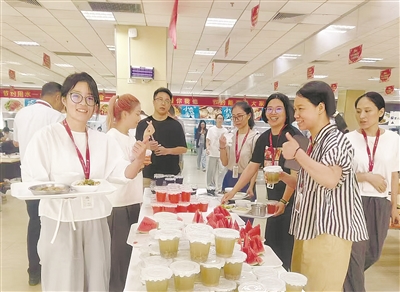 “酸梅汤来一杯,食堂自己做的放心!不添加任何防腐剂……”“这款青柠汁也好喝,不酸不涩,很合我口味。”饭后,只见职工纷纷走向“夏送清凉”的区域,你一杯我一杯,感受食堂带来的清凉“幸福味”。