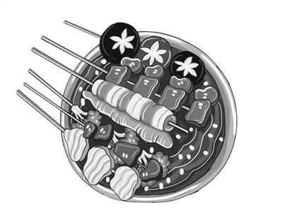 一位阿姨骑着电动车,后座带着穿校服的孩子,熟门熟路地来到摊前,“老板,今天豆腐干没有了啊?拿一串北极翅,一串虾丸,豆腐油泡看着放一点吧,葱香菜都要的哈。”