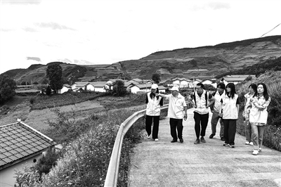 | “追光团”跟随钱海军(左二)在四川省凉山彝族自治州布拖县俄里坪镇实地调研“千户万灯”给当地村民用电及生活带来的改变。通讯员姚科斌 摄 |
