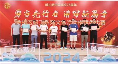 7月24日至26日,杭州市余杭区级职工棋牌类比赛在余杭经济开发区总工会“爱心驿家”举行。棋牌爱好者们踊跃报名参与比赛,在象棋、围棋、掼蛋三个备受欢迎的项目上对弈比拼。
