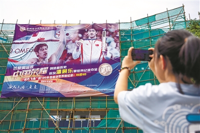 | 潘展乐巨幅海报引人注目 昨日,正在翻修的温州市少年游泳学校的脚手架外面,挂着温州籍奥运游泳冠军潘展乐破世界纪录的巨幅海报,吸引来往的路人纷纷驻足拍照。通讯员刘吉利 摄 |