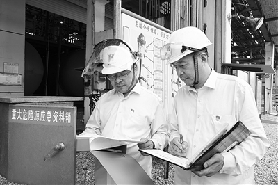 面对持续高温,巨化集团氟聚合物事业部全面落实双重预防机制,打好防暑降温送清凉、安全管理与督查、日常巡检、隐患排查治理“组合拳”,确保生产装置平安度夏。图为该事业部单体装置部安全管理与专业人员对照重大危险源检查表开展项目内容自查。