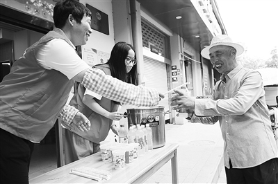 日前,在绍兴市柯桥区华舍街道温渎社区户外劳动者服务站点,志愿者为环卫工人、快递小哥等送上绿豆汤、矿泉水等清凉饮品。除了送上清凉消暑饮品外,柯桥区总工会还在各个户外劳动者服务站点配备了冰袋、藿香正气水等防暑急救物资,为烈日下作业的外卖、快递、环卫、保安等行业的户外劳动者送去一份关爱。