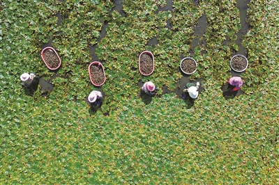 昨日,在温岭市箬横镇双透村一处百亩级的菱角种植区内,菱农们以手为桨、穿梭其间,娴熟地摘下一枚枚水灵灵的菱角。据了解,过了农历七月中旬后,当地各个菱角水塘开启全面采收,日均可供应市场超1000公斤。