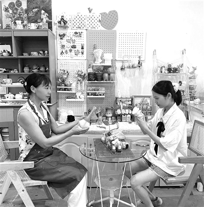 去年5月1日,这家母女俩合开的陶艺手作店正式营业。王明花负责店内的日常运营,吴嘉丽则用3D打印技术制作工艺品,丰富店内的元素。