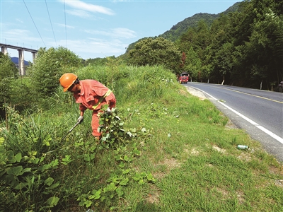 图为中心池淮公路站的养护人员正在城白37K+900路段清理路肩蔓藤杂草及路人丢弃的垃圾。 徐曙光、余坚 文/摄