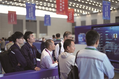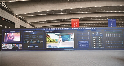 “赛场一景”:位于大赛决赛主赛场一侧的空地上,立着一块长30多米、高8米的巨大数据屏,实时滚动播放着各赛项比赛画面和参赛选手排名情况。