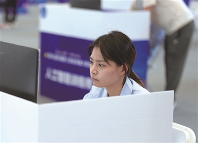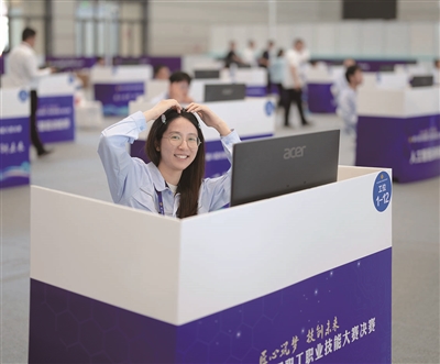 “眼神杀”:人工智能训练师赛项的比赛现场,是一场智力与体力相结合的挑战,选手们需要在10个小时的实操比赛时间里完成3个板块任务。图为11日下午,人工智能训练师赛项浙江代表队选手王小芳专注比赛,上演“眼神杀”。