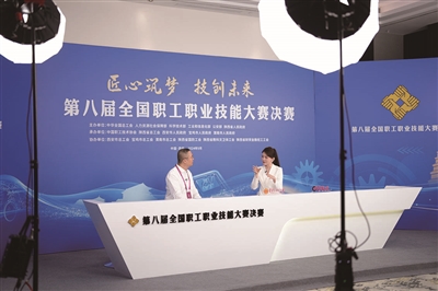 ▲“云观赛”:选手在场上技能比武,设置在决赛场外的直播间也没闲着,来自各界的大国工匠、技能专家、优秀选手等走进直播间分享比赛经验,陪伴线上职工群众“云观赛”。