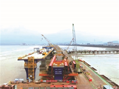 | 杭甬复线宁波三期海域高架桥施工现场。 |