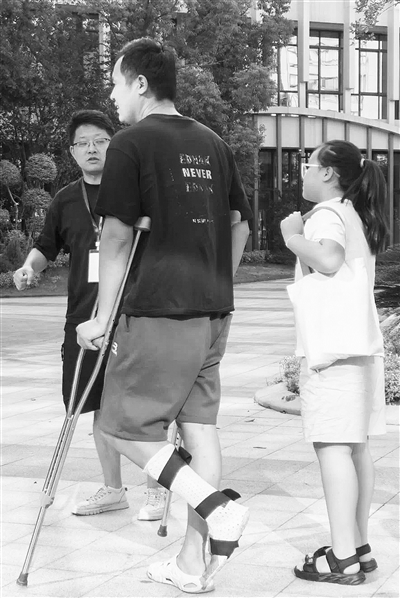 | 一名脚部受伤的考生在女儿陪伴下赴考。 |