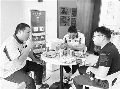 图为新就业形态劳动者在驿站享用下午茶。