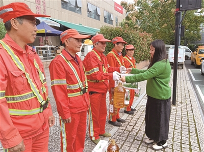 昨日,浙工天禹环境工程有限公司负责人为坚守在道路保洁一线的岗位老员工,送去节日慰问和美好祝福,收到“重阳节”礼物的老员工纷纷表示,今后将继续做好“美丽上城”“典范杭州”城市建设,让杭州更加干净整洁。通讯员吴伟胜 摄