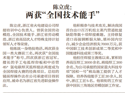 这些年,陈立虎始终以劳模精神、工匠精神保持着技能强国的初心,在技能强国的大道上步履坚定,不但在关键的时刻挺膺担当,助企攻坚克难,解决技术难题,还将自己的毕生技艺传授给下一代,培养造就了一大批高技能人才。10多年来,他和教练团队累计培训特种设备高压焊工3000余名,民用核安全设备焊工300余名,指导培养出省级劳动模范2名、全国技术能手3名、各级能手工匠20余名。还加入到省劳模工匠技术服务队,用精湛的技术帮助其他企业解决技术难题——为企业解决各类工程焊接难题50余项,累计为企业降本增效8000余万元,推动企业高质量发展。