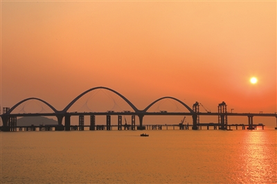 近日,建设中的台州1号公路玉环西沙门大桥,与深秋晨光、大海、天空,构成了一幅多姿多彩的美丽画卷。