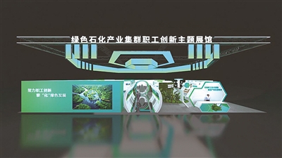 绿色石化产业集群职工创新主题展馆以“聚力职工创新,擎‘化’绿色发展”为口号,围绕“产业历史沿革”“代表企业”“技术创新成果”“劳模工匠人物”四块核心内容,搭配一个“绿色花园工厂”展区。