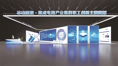 集成电路产业集群职工创新主题展馆以“芯动浙里,@未来”为口号,总体围绕一个“芯”字,设置了“芯”起点、“芯”突破、“芯”智力、“芯”体验、“芯”愿景等展区。集中展现浙江省集成电路产业链、生态链、供应链和创新链协同发展情况,重点展现职工创新团队、代表人物、劳模工匠的创新成果和对行业的贡献。