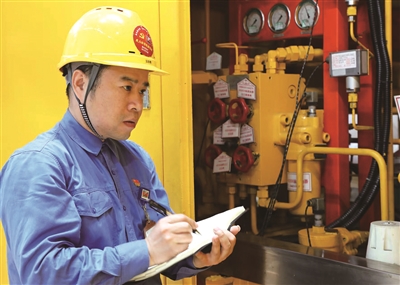 | ▲汪忠德正在巡检设备。 记者羊荣江 摄 |