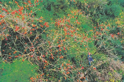晚秋时节,余姚市大岚镇柿林村的红柿悬挂在枝头,呈现出一派独特的山村丰收美景,吸引大批游客前来游览、体验采摘。