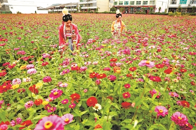 近日,在温岭市新河镇六闸潮村,游客正在花海里留影。六闸潮村通过流转30亩土地,一年四季轮流种植马鞭草、波丝菊、向日葵、油菜花等,让村在画中、人在花中,吸引游客纷至沓来、赏花取景。