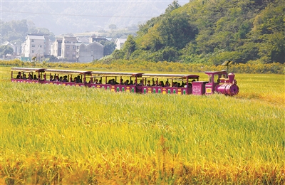 金秋十月,温岭市城南镇推出“田园牧歌”农旅项目,让前来秋游的学生走进大自然,呼吸泥土的芬芳,感受丰收的景象。图为小火车途经丰收的田野。