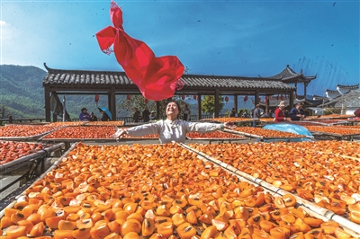 近日,衢州衢江区峡川镇东坪古村晒秋的柿子,橙红金黄,一派丰收景象,一位游客欣喜地将纱巾扔向空中。近期,该村的2000余株柿子树挂满了小灯笼般的柿子,迎来一年中最美的季节,前来赏景秋游的市民熙熙攘攘。秋意浓浓的古村,摄影师来了,游客来了,流量来了,村民的收入也来了。通讯员胡江丰 摄