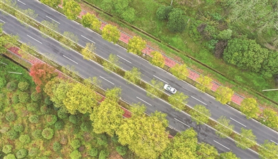 近日,航拍湖州市德清县莫干山镇的三莫线,公路两侧的百年梧桐枝繁叶茂,车行其间宛若画中游。