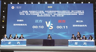 | 比赛中,安徽代表队与浙江代表队展开激烈辩论。见习记者贾馨然 摄 |