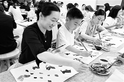 | 国画基础公益课上,学员们认真学习画麻雀。 |