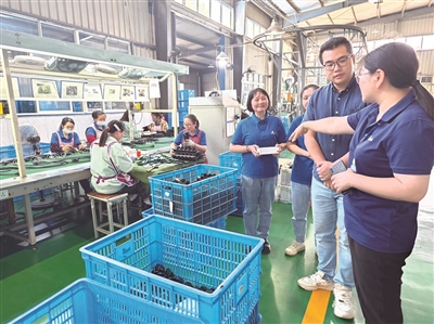 | 记者李凡(右二)在浙江双羊集团插头车间流水线上与职工亲切交流,右四为作者李玲。 |