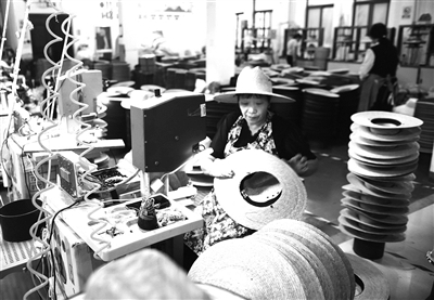 图为近日,位于小芝南丰村的台州金铭威工艺帽业有限公司员工正在加工成品草帽,该产品远销海内外。
