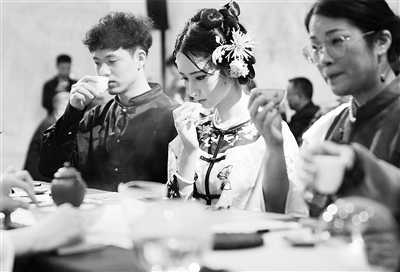 11月14日,人们在杭州秋季茶博会上举行的一场茶会中品茶。