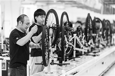 图为近日,金华市义乌洛克体育用品有限公司生产线上,工人正在组装出口海外的山地自行车。