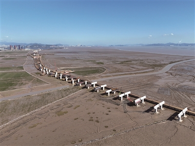11月24日,退潮后的温州市乐清湾,滩涂区域的滨海大道桥梁建设现场塔吊林立。该项目工程主线长度5.953km,采用一级公路兼顾城市道路功能技术标准,其中乐清湾沿海滩涂区域采用“桥堤结合”、跨越海涂造桥方案,加强沿海滩涂的开发利用和生态环境保护。