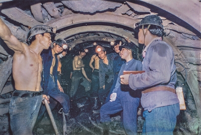 | 1999年6月16日 本报记者吴杭民、章勤、王蔚(右一、右二、右三)在长广集团公司七矿的千米深井下采访。 |