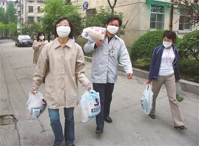 | 2003年4月 “非典”爆发,本报记者雷虹(右一)等早于其他媒体,首先进入“疫点”采访,并与社区和有关防疫人员给居民送物品,受到了有关部门的表扬。 |